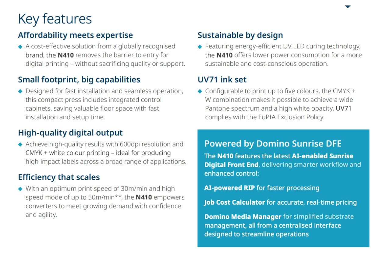 La N410 de Domino abre tu futuro digital con curado UV LED y el respaldo de una marca global de confianza. Está diseñada para convertidores que desean explorar nuevos mercados y ampliar su oferta, combinando una huella compacta, instalación rápida y alta eficiencia.